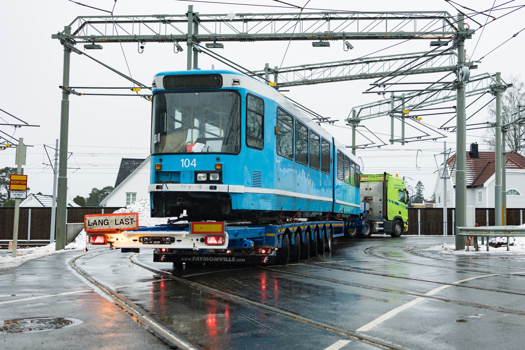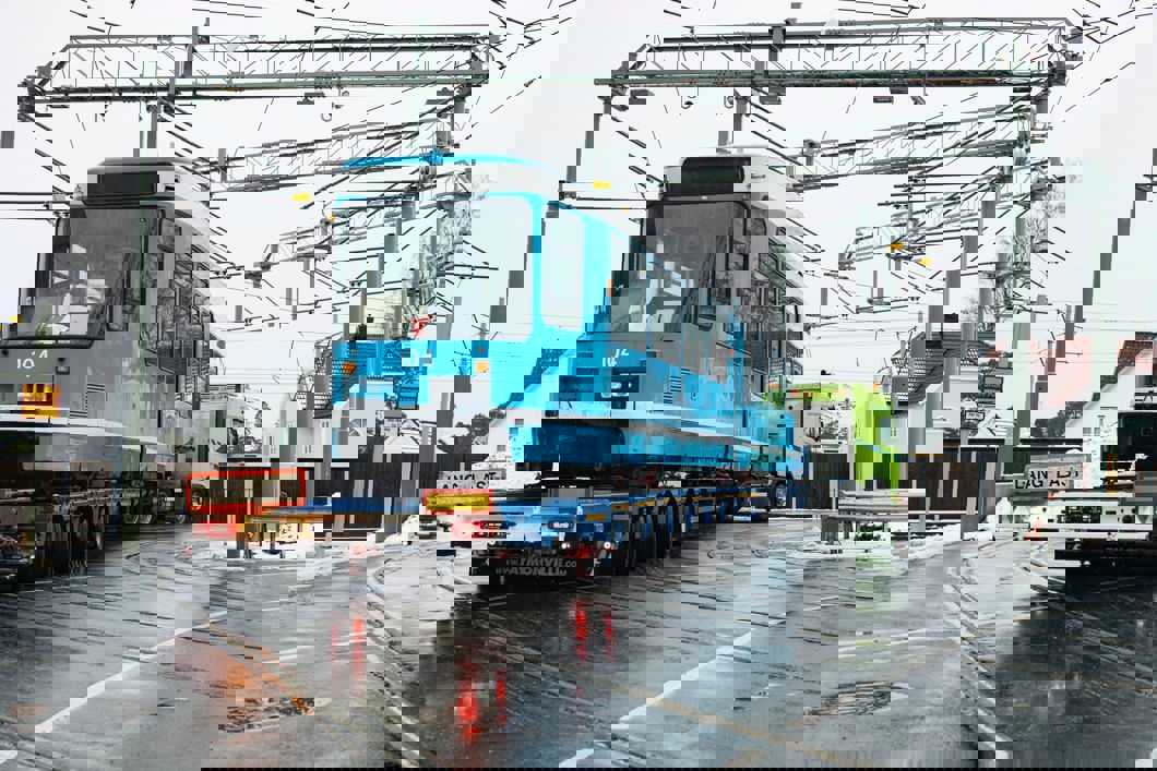 Blir nye råvarer: Tirsdag forlot vogn 104 trikkebasen til Sporveien på Holtet i Oslo. Ferden gikk til Fredrikstad der trikkene blir demontert. Noen av delene blir smeltet om til nye vedovner. Foto: Alf Simensen NTB / kommunikasjon.