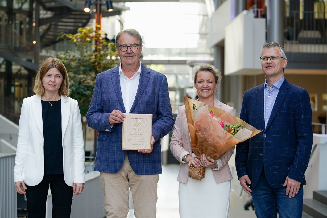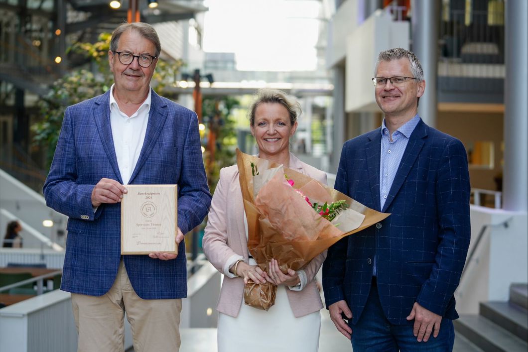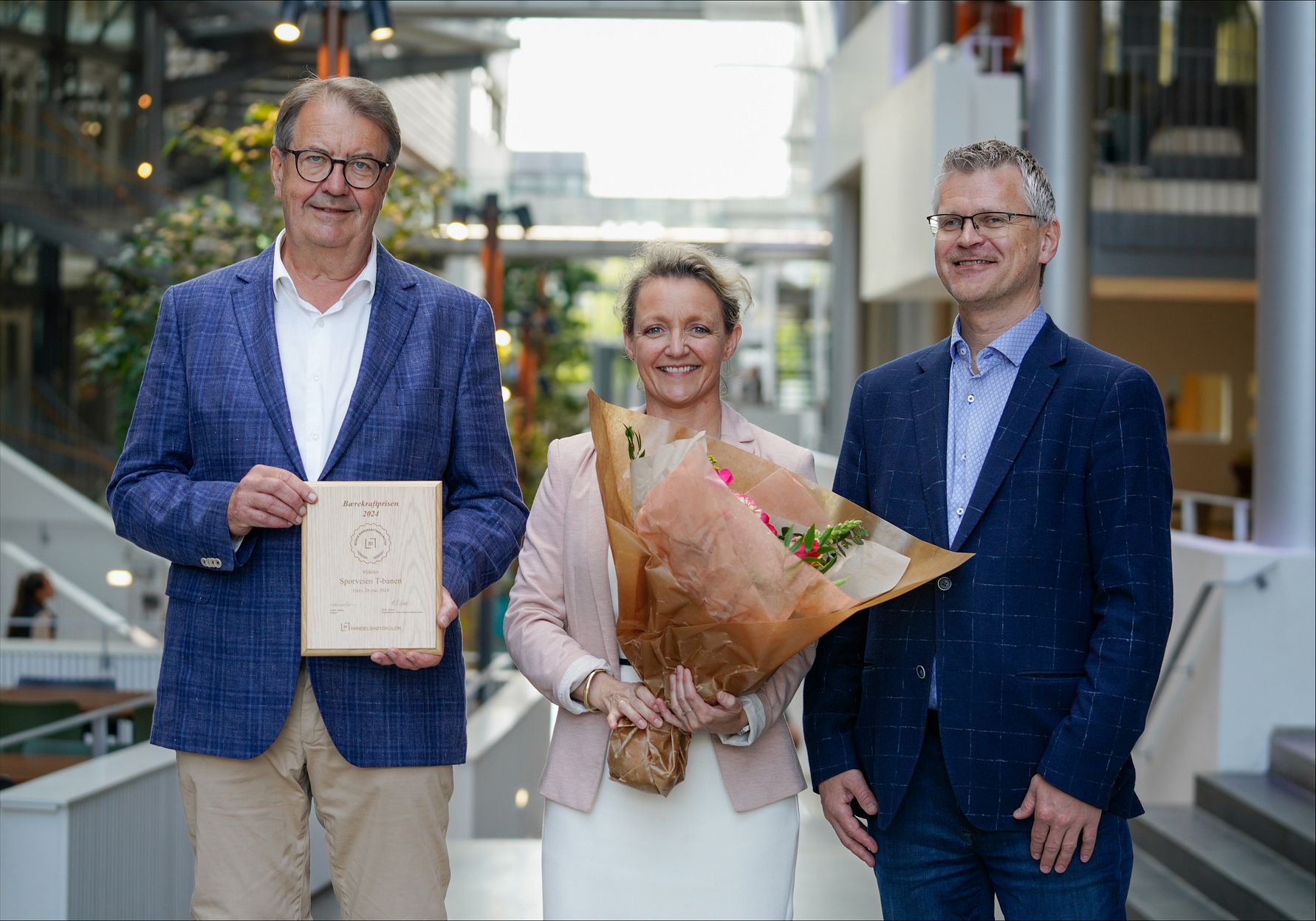 F.v. Per Magne Mathisen, administrerende direktør Sporveien T-banen, Birte Sjule, konsernsjef i Sporveien, Pål Silseth, prosjektleder for Norsk Bærekraftbarometer og høyskolelektor ved Handelshøyskolen BI. Foto: Sporveien.