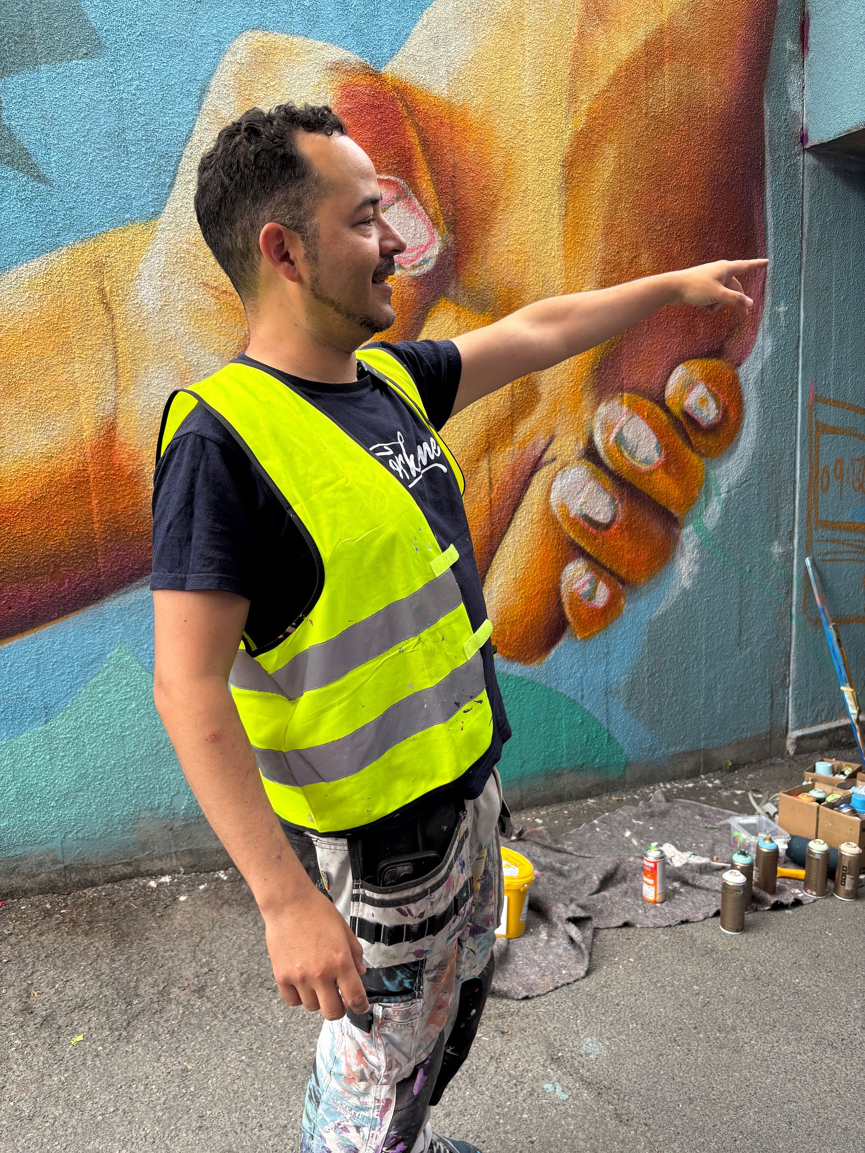 Gatekunstverket springer ut av en workshop som han holdt med klasse 5A i januar 2023. Elevene utforsket temaet "Livet og savnet i pandemien", og laget skisser som nå danner utgangspunktet for den ene delen av kunstverket. På den andre veggen skal det males et motiv som handler om å rekke skole, jobb – og livet ellers.