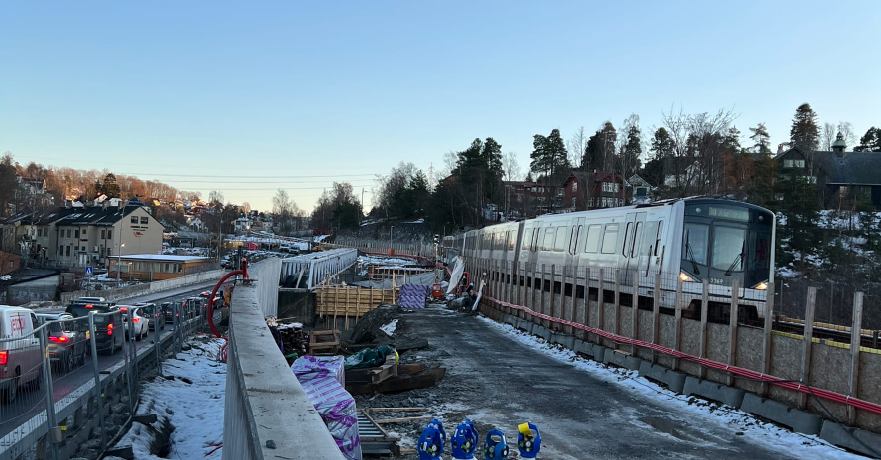 STENGES FOR BILTRAFIKK: Nye Bryn bru må løftes inn av to store kraner fra Østensjøveien over fjernevarmebrua midt i bildet, og derfor stenges Østensjøveien frem til tirsdag 14. februar. Under byggeprosessen har alle T-banetogene brukt sporene til Lambertseterbanen (til høyre) via en midlertidig sporforbindelse.
