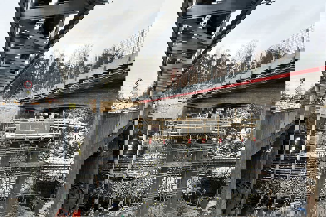 Helgen 11.-12. februar skjer den siste store operasjonen, med innløfting av flere 20 tonn tunge betongelementer. Når den siste T-banen er kjørt forbi klokken 02 natt til søndag, løftes og monteres elementene suksessivt fra hver sin side på brua.