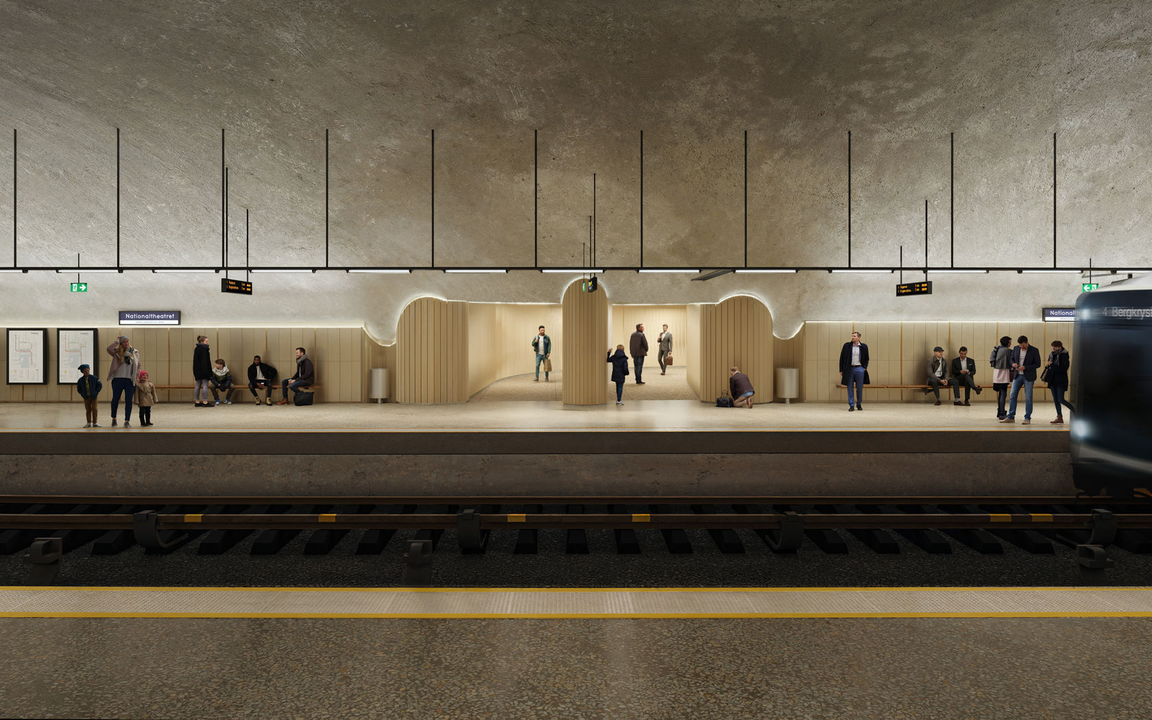 Nationaltheatret T-banestasjon stod ferdig i 1928, og 100 år senere kan stasjonen bli seende slik ut. Frem mot 2028 skal Sporveien oppgradere T-banens sentrumsstasjoner. Illustrasjonen er en foreløpig skisse, og endringer kan forekomme (Foto: HISM Arkitema/ Sporveien).